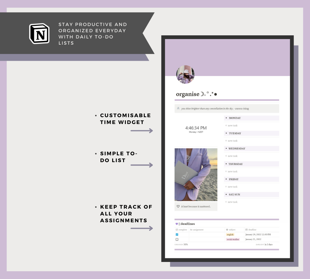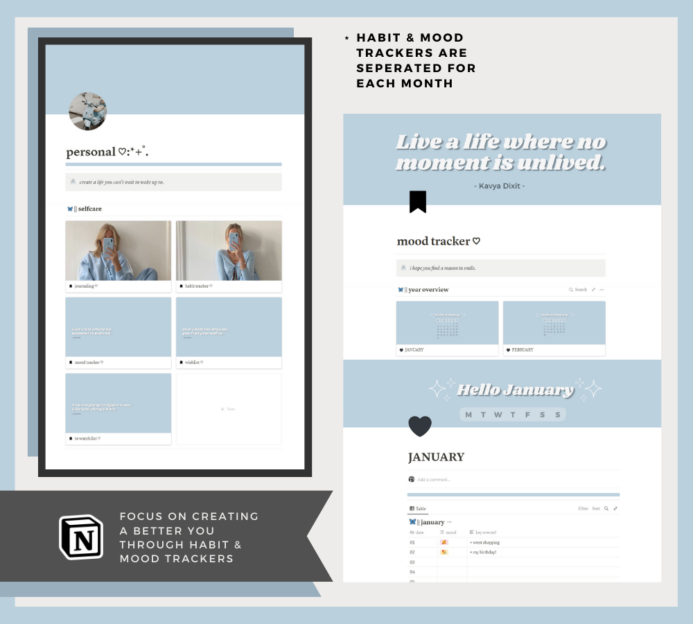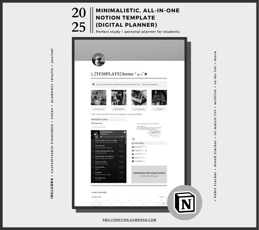 This minimalistic, aesthetic, all-in-one Notion template is a customizable template to help make your life more productive and organized!