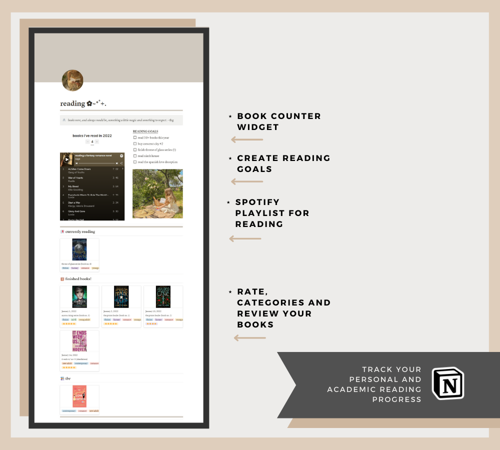 Keep track of what you are currently reading, have read and want to read using this cottage core aesthetic inspired reading Notion template!